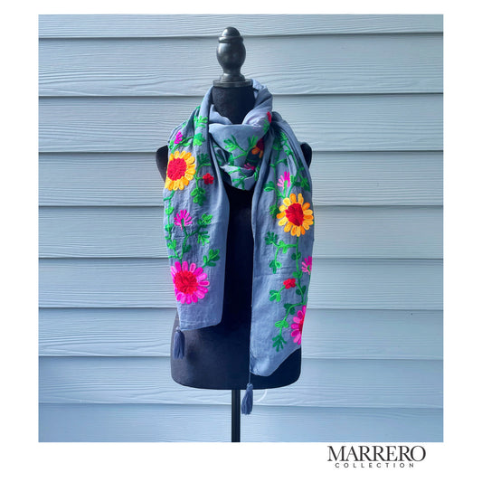 Denim Blue Floral Embroidered Shawl